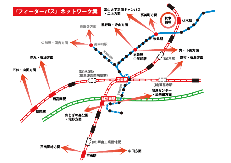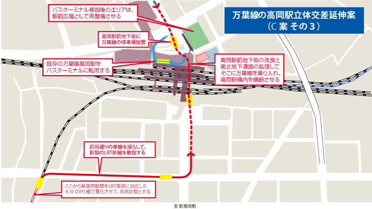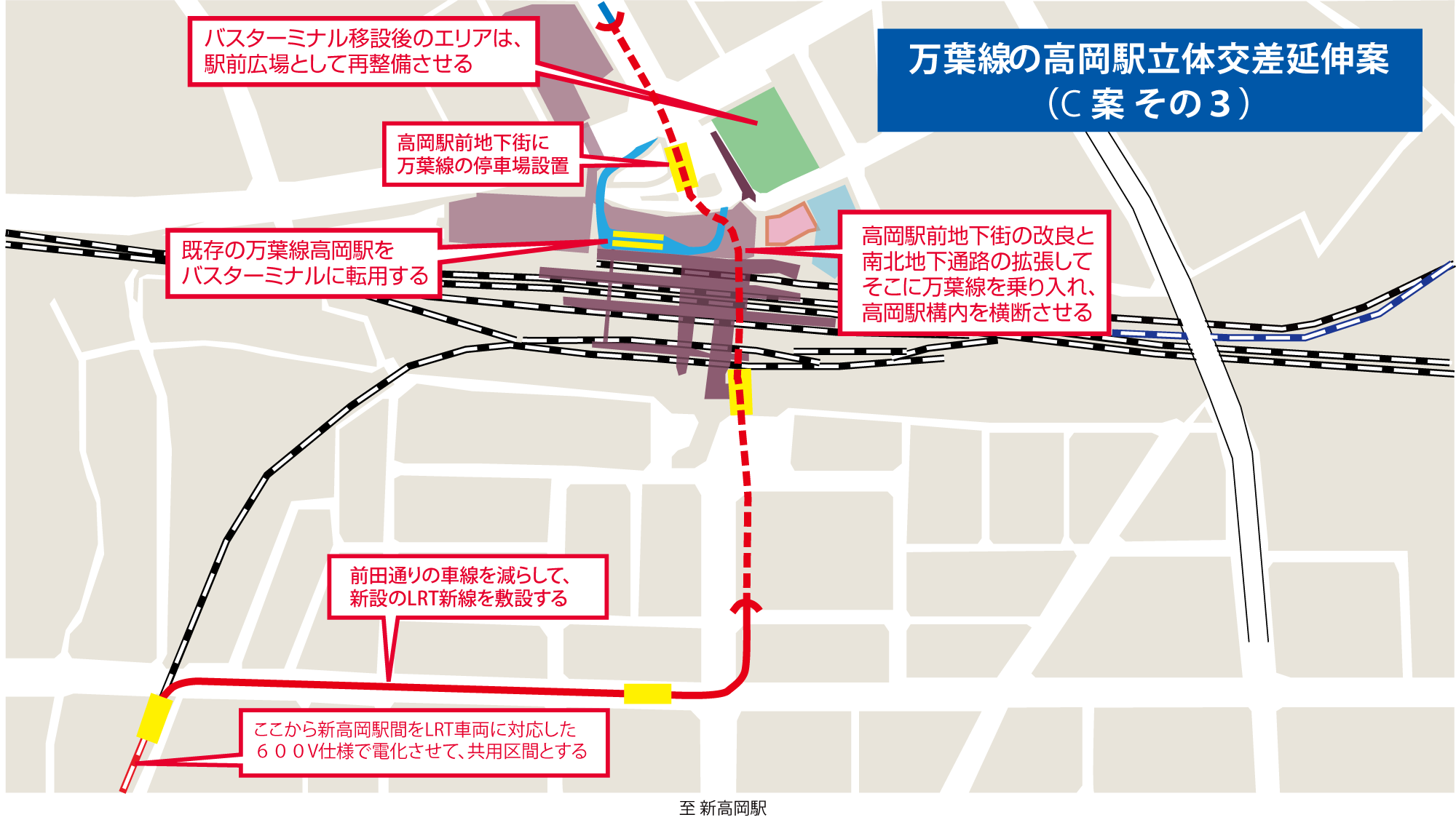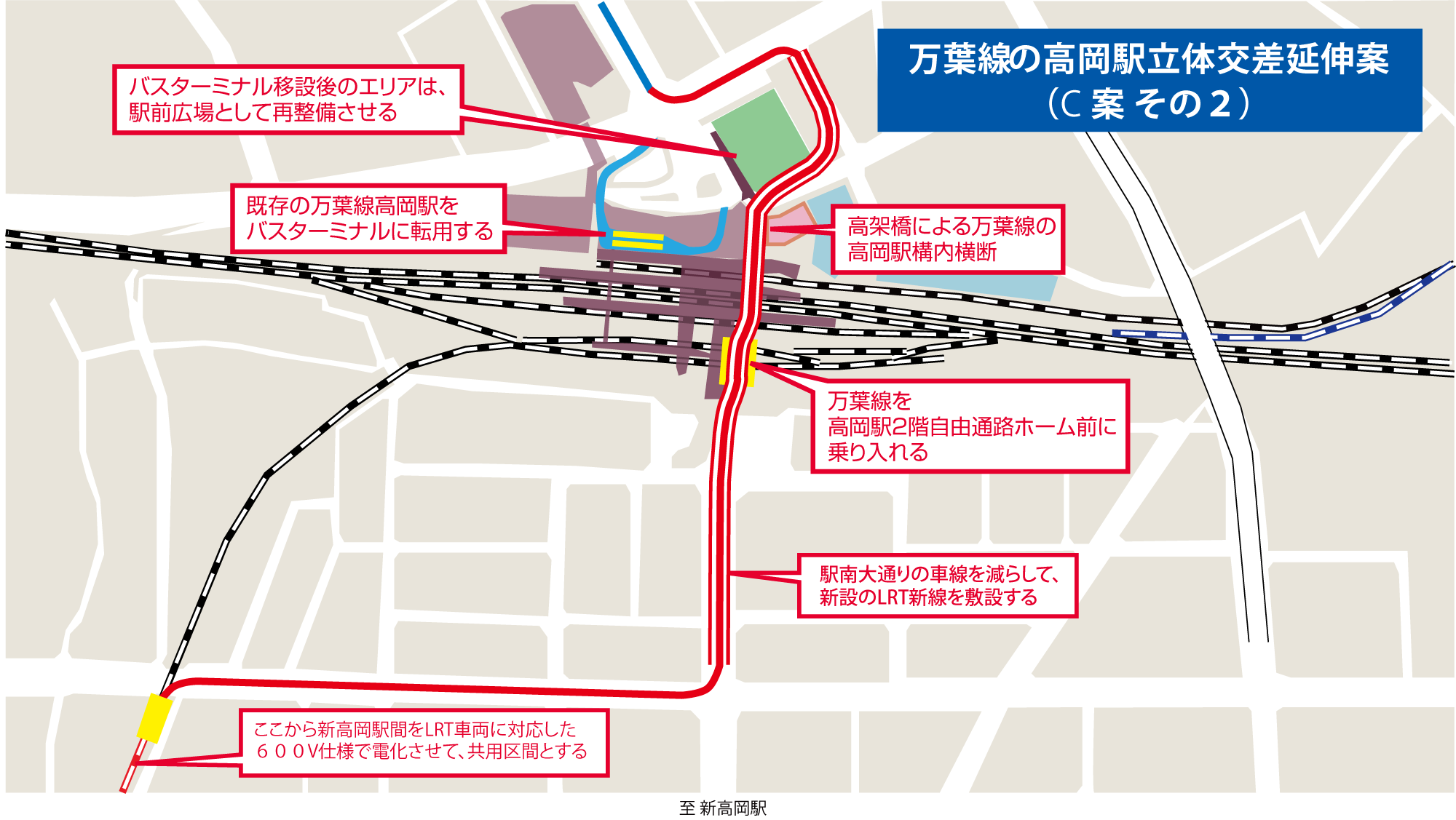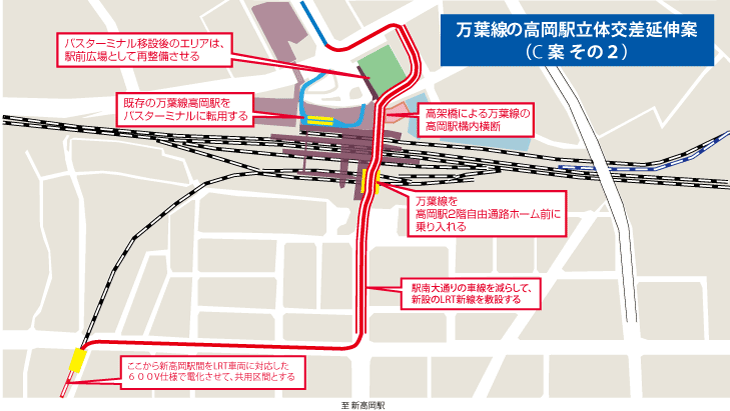 県道58号線を改良して、万葉線のLRT線を整備することで新高岡駅まで延伸させる。あいの風とやま鉄道との立体交差化は、県道58号線の陸橋を、1車線減らしてLRT線を敷設して対応する。将来的には、高岡駅を跨ぐ新設の南北道路を検討する。
