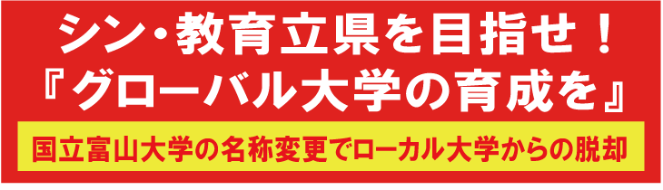 <『ローカル大学からの脱却』〜国立富山大学の名称変更〜> 国立富山大学は、もともと旧2期校のため、大学ランクでどうしても低く見られてしまう傾向にある。また、大学名でも富山を名乗る事で、ローカル都市の大学というイメージが付いている。このような、ローカル大学から、富山大学は変革をしていかないと、全国的に生き残れないだろう。東北大学、九州大学のように、都市名からエリアを総称する大学名になれば、広域から学生を集めやすくなり、外国からの留学生の誘学も期待できるだろう。 大学改革で、1大学法人のもとに複数の大学をぶら下げる『アンブレラ制度』が認められるようになったのを、富山大学でも取り入れたい。独立大学法人の富山大学は名称を残しつつ、現在の富山大学を2つの大学に分ける。ひとつは、富山市内にキャンパスを構える大学として『日本海大学」を設立する。大学名に、日本海を使う事で日本全国を対象にした大学イメージを持たせる。学部数は、新たに設ける学部も含めて10学部の総合大学とする。また、高岡市内にキャンパスを構える大学として『北陸芸術文化大学(高岡芸術文化大学)』を設立する。こちらは、北陸を冠につける事で、三大都市圏からの学生確保を狙う。学部数は、新設も含めて、5学部の総合大学を目指す。これらの取り組みで、金沢大学や新潟大学との差別化と、ランク逆転を狙いたい。 <行政による大学育成と支援『大学強化専門チーム』の新設> 厳しい状況の大学経営をサポートするのは、行政の役割となる。その為には、県庁内に『大学強化専門チーム』を新設する必要がある。行政の財政も厳しいが、工業団地の造成や誘致企業の補助金制度のような産業育成を、大学育成にも適用していく必要がある。大学誘致にはこれまでも、大学設置に必要な用地を無償提供や補助金制度があるものの、大学育成に掛かるアフターケアが不足している。大学の増学部などに必要な新規用地や教職員確保、更に学部増設の許認可で行政職員の派遣など人的サポートをする。ハード面だけではなくソフト面でのケアが必要であろう。
