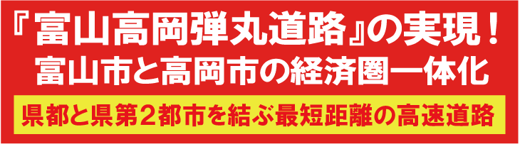 <富山高岡弾丸道路『海側ルート』と『山側ルート』の実現を!> 県第一都市と県第二都市間に高速道路が無いのは、全国的にも珍しく、富山県にとっては、経済的にみて致命的ともいえる。 現在計画されている地域高規格道路の富山高岡連絡線は、交通量の多い交差点を立体高架化していく手法の為、アップダウンの激しい道路となるだろう。これは、北陸自動車道金沢西IC-東IC間の側道として交差点立体交差化が進む国道8号線のような形式だ。これでは都市間を結ぶ幹線道路として、安定した高速走行が出来ず"中途半端な高規格道路"と言わざるを得ない。今後は、ルートを見直して、金沢外郭環状線(海側)と同様に、連続立体高架化の本線自動車専用道4車線化・側道4車線化へと、整備計画を再検討させる必要がある。 つまり、富山市と高岡市を最短距離で結ぶ高速道路『富山高岡弾丸道路』の実現だ。この富山高岡弾丸道路を、海側ルートと山側ルートの2本で整備を図りたい。 まず『海側ルート』だが、北アルプス横断道路構想『北國自動車道』の起点を高岡北ICとして、富山市から長野県へ抜けるルートと直結させるカタチで実現させたい。 地域高規格道路として構想されている富山高岡連絡道路を、北アルプス横断道路に組み込み、能越道にも直結させる。能登エリアの復興と振興の役割も持たせたい。 次に『山側ルート』だが、現在の「高岡南郷ー北陸道小杉IC手前間(5キロ程度)」を、北陸道のロングランプとして整備させることで、富山ICから小杉JCTを経て、事業が進んでいる高岡環状道路に接続させる。現在の北陸道も活用できることから、安価で整備ができるうえ、能越道高岡IC−北陸道小杉IC間が一直線で結ばれる意義は大きい。都市高速が先行的に整備が進んでいる、新潟市や金沢市に追いつくことを目指したい。